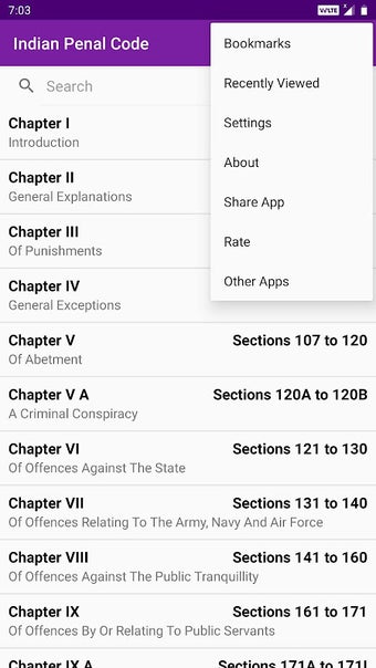 이 앱은 모든 가능한 검색 옵션으로 섹션을 북마크하고 취소할 수 있습니다. 어떤 섹션의 내용도 읽어주는 음성 어시스턴트가 함께 제공됩니다. 사용자는 챕터 및 섹션의 완전한 내용을 소셜 미디어, 메일, 메시지 및 기타 공유 앱으로 공유할 수 있습니다. 이 앱은 최근 본 섹션을 읽을 수 있는 옵션도 제공합니다. 전문적이고 사용하기 쉬운 인터페이스로 인도형사법전에 대한 정보를 찾는 데 탁월한 자원입니다.